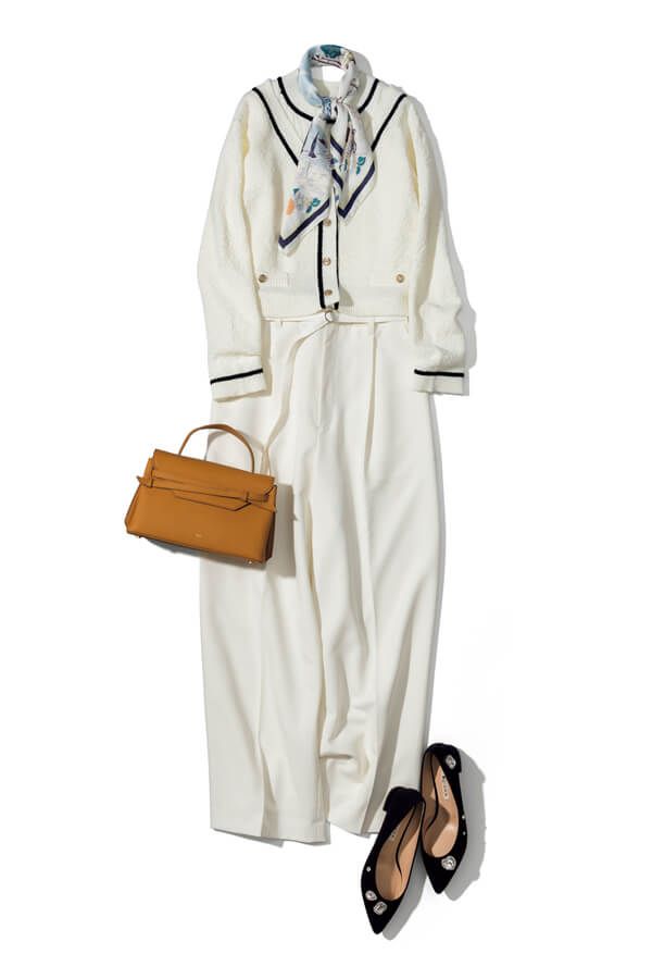 スカーフ¥2,970/ロペピクニック(ジュンカスタマーセンター) アンサンブル¥19,800/リランドチュール パンツ¥7,990/アンフィーロ(オンワード樫山) バッグ¥35,200/トーヴ(アンソロジー) 靴¥20,900/ダイアナ(ダイアナ 銀座本店)