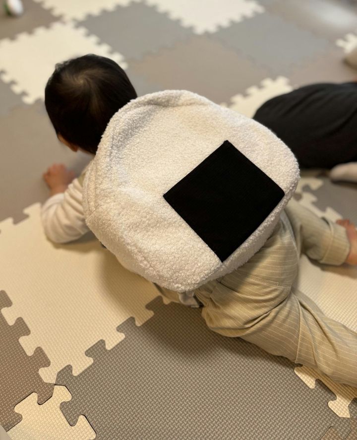 体からはみ出るほどのサイズのおにぎり型のリュック。遠くから見てもおにぎりとわかりますし、お米のつぶつぶ感が表されていてとてもかわいいです…。お子さんが成長されても普段のお出かけに使えますし、このリュックを持ってピクニックに行きたくなってしまいますね。