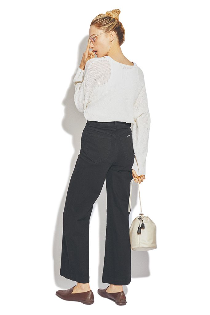 どこか無防備で、自然体。それでいて絵になる後ろ姿。そんな理想を追いかけてたどり着いたのは、ジェーン・バーキンが愛したハイウエストデニム。余白を感じる後ろ姿は、ラフなのに気品が宿る。シャツをインするだけで、媚びないフェミニンが完成。計算され尽くしたディテールで、定番デニムに今のムードを。 黒デニムパンツ/ROLLA’S(ジャック・オブ・オール・トレーズ プレスルーム)