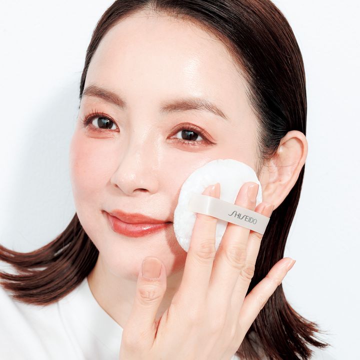 メイクの最後にコンシーラーでシミを隠したら、肌感を損なわない透明のルースパウダーをパフでふわっとのせて。こするとコンシーラーがとれてしまうので、優しく押さえるような手つきで。