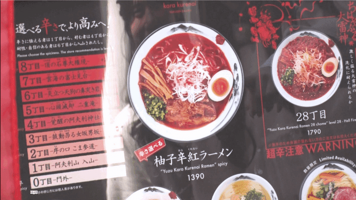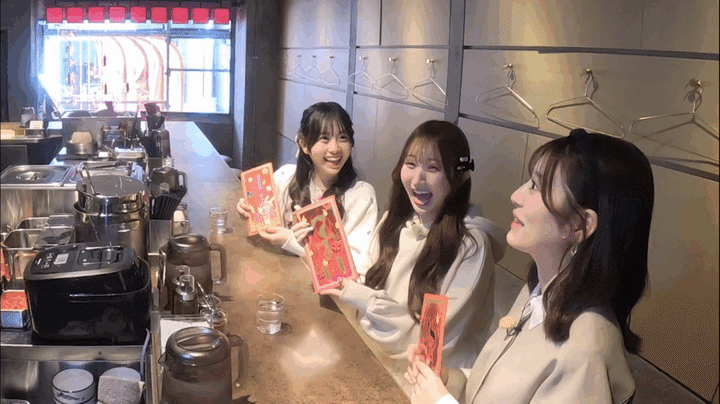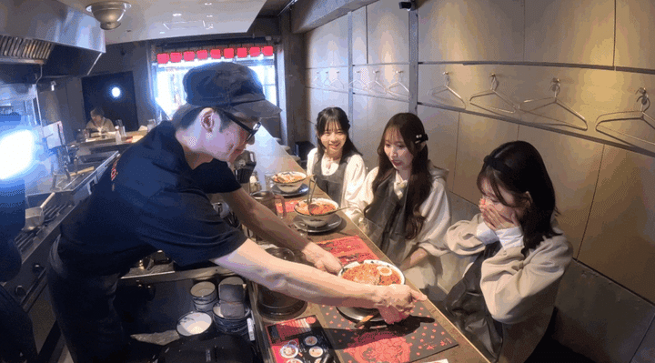 見るからに辛そうな真っ赤なラーメンがラインナップされたメニューを見ただけで悲鳴を上げる3人。「なにこれ?色ヤバい!私の衣装くらい赤い!」と月足が絶叫すれば、小川と栗田は「完食!?」とビックリしすぎて大爆笑だ。
