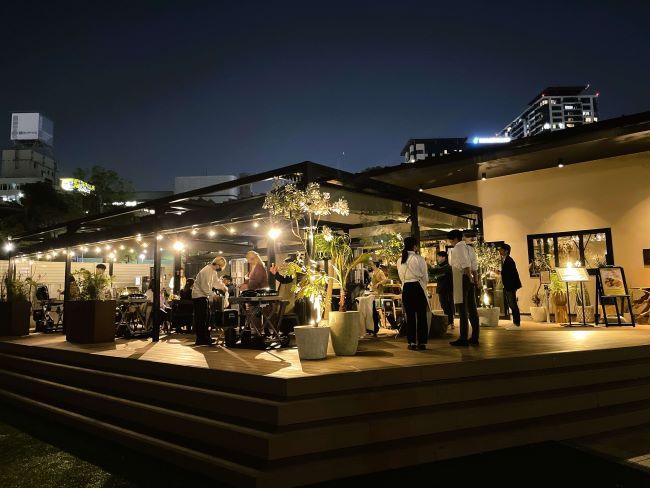 BBQがいただけるテラス席の目の前は芝生。昼間は公園の緑に囲まれながら、爽やかな風を感じてまったり。夜はライトアップされた扇町公園を眺めながら、ちょっぴり大人な雰囲気に。どちらの時間帯も、リラックスしつつ特別な時間が過ごせそう!