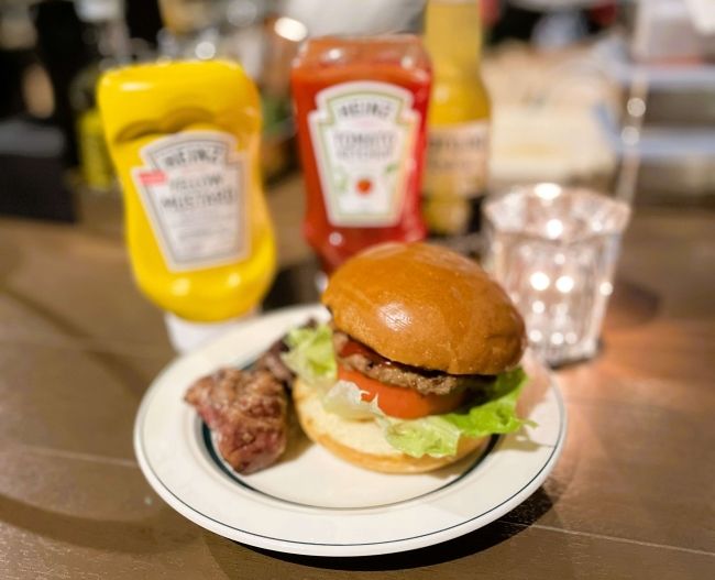 こちらは自分でパテを焼いて作るハンバーガー。ビーフのうまみを強く感じるパテとシャキシャキなサラダを、少し温めたバンズでサンド!ケチャップやマスタードで自分の好きに味付けできるのも◎