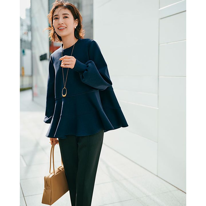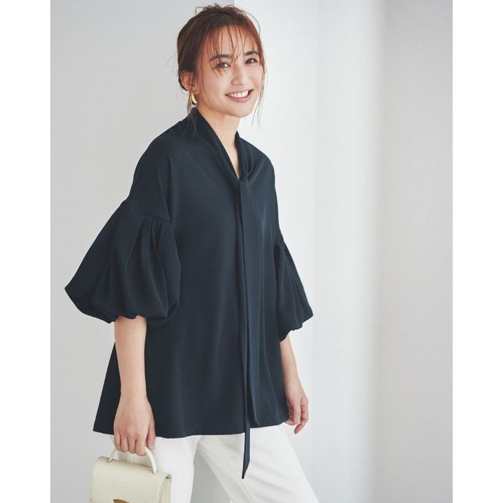 母行事にネイビーブラウスが重宝! タック入りのバルーン袖で 甘さ控えめの洗練された印象に