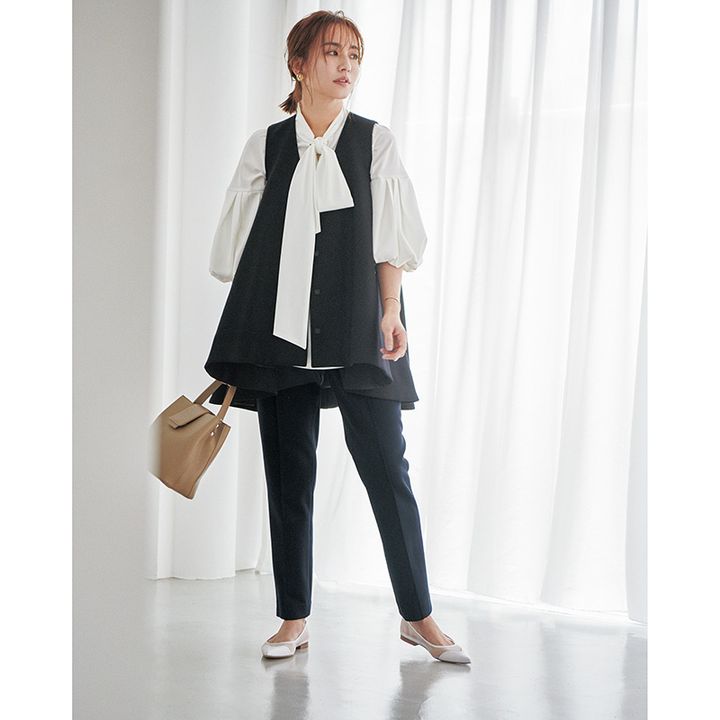 大きめボウタイの存在感で ネイビーコーデに甘さを。 美脚シルエットで細見えも叶う