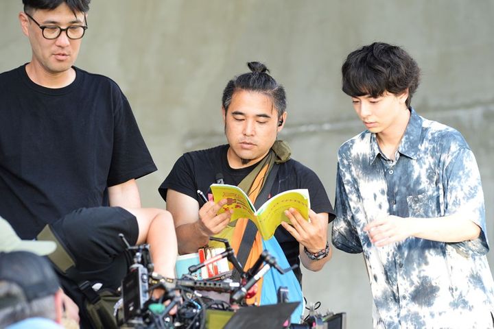 撮影中のようす:柄本時生さん演じる「先輩」(左)と高杉真宙さん演じる「健太」(右)