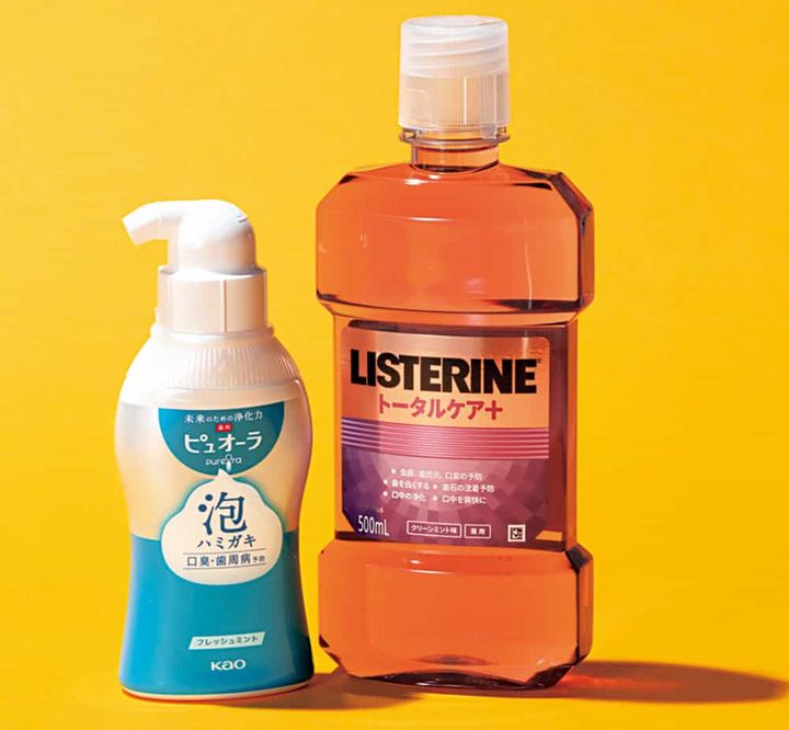 (左)舌に泡を直にのせ10秒ほどクチュクチュしてから通常歯磨きで歯間の菌にアプローチ。ピュオーラ 泡ハミガキ フレッシュミント(医薬部外品)190㎖ ¥1,375(花王)