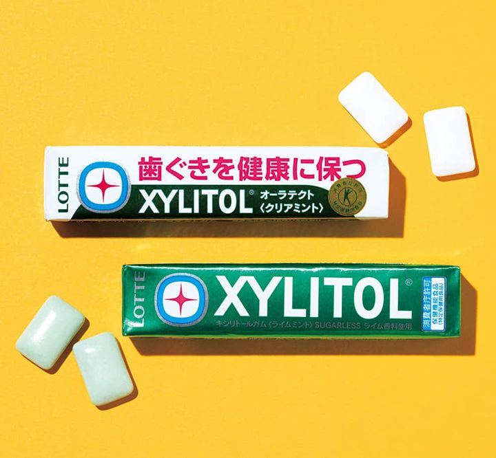 (下)むし歯の原因にならない甘味料を使い、食事のたびに起こる脱灰で失われたミネラルを戻す再石灰化を増強するキシリトール配合のトクホのガム。ロッテキシリトールガム〈ライムミント〉オープン価格