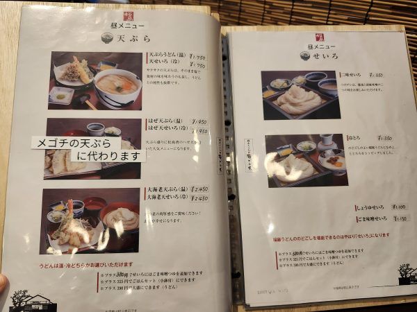 お昼のメニューはこちら!冷たいせいろから温かいおうどん、天ぷら付きなど魅力的なラインナップに心が躍ります。