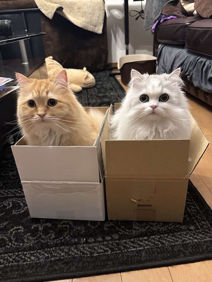 愛猫たちの避難先。掃除機かけたらダンボールにちょこんと収まっている姿が話題に「ここに入れば安全だ!と思ってるのかな」「避難先がかわいい」