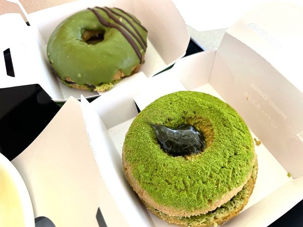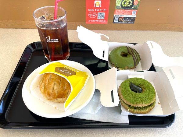 2回目では筆者が好きなポンデリングを中心に、ミスドのドーナツで1番高いザクもっちシリーズを注文。これまた辻利コラボの「ポン・デ・ザク宇治抹茶 きなこ」(テイクアウト237円、イートイン242円)、「ポン・デ・ゴールデンストロベリー」(テイクアウト205円、イートイン209円)、「ザクもっちドッグ メキシカンミート」(テイクアウト313円、イートイン319円)です。