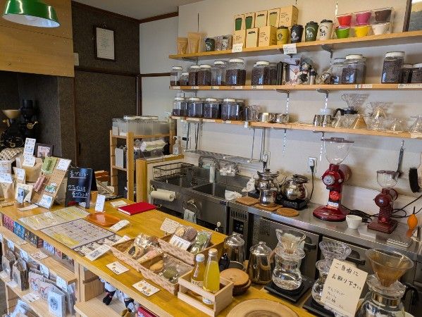 駐輪場、駐車場(1台)があるので、車でも自転車でも来店可能です。 店内に入ると、たくさんのコーヒー豆が並んでおり、コーヒーの器具なども販売されていました。