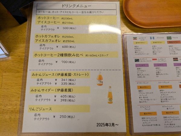 私が気になったのは、カフェインレスコーヒーの種類の多さ。こちらのお店では、カフェインレスコーヒーを5種類から選ぶことができるんです。今回は「ホットコーヒー2種類飲み比べ」(700円)で、カフェインレスのコロンビアとブラジルを注文。