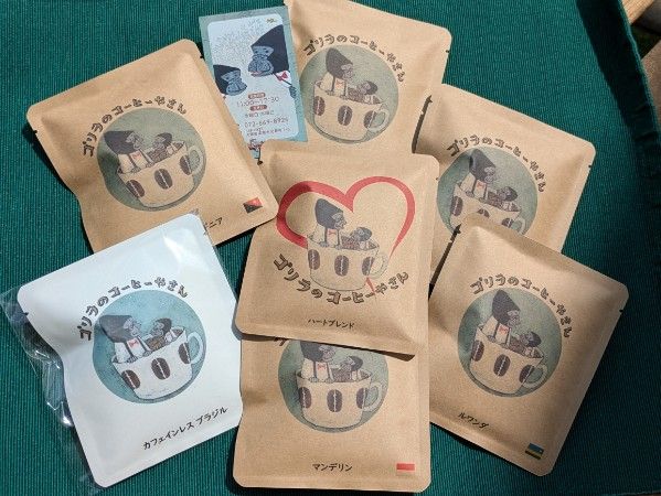 こちらのお店では、豆や焙煎へのこだわりはもちろん、“手作り”を大切にされています。ドリップバッグは、自家焙煎された豆をその場で挽き、バッグに詰めるところまで手作業。ゴリラ親子のイラストがプリントされていて、とってもかわいい♪