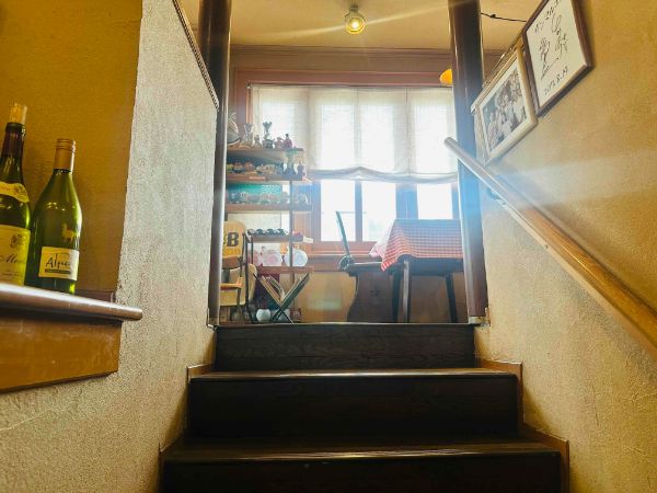 階段の壁には「いらっしゃいませ」の挨拶文字が並び、温かく迎えてくれます。