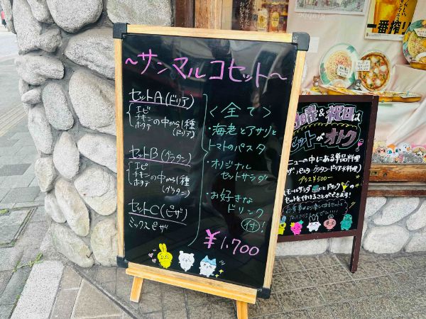 入口にはウェルカムボードが出ていて、セットメニューの紹介や食品サンプルもあるので、初めての方でも入りやすい雰囲気です。