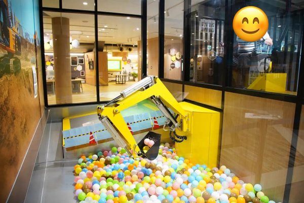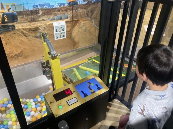 ショベルカーでボールをいくつ運べるか。見てるよりやると意外と難しくタイムオーバーになってしまいます。