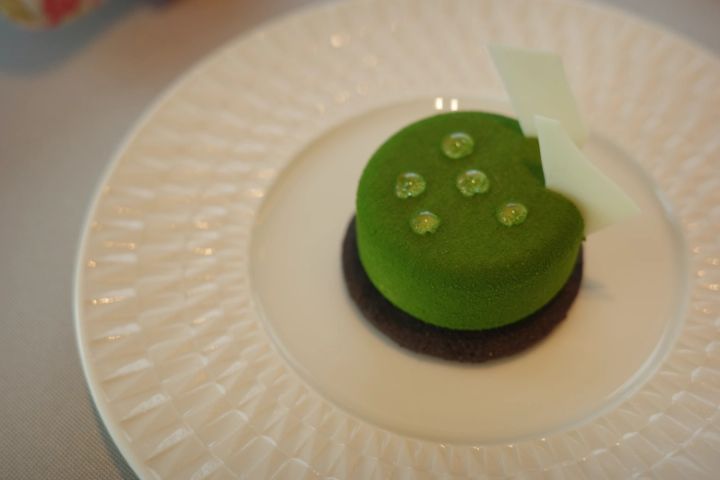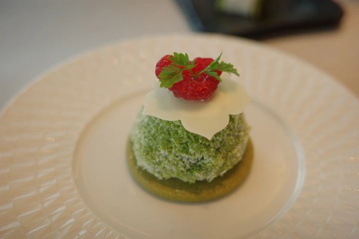 「おいしすぎる…!!」と盛り上がったのがこちらのセイボリー。水紋ように美しく絞られたブロッコリーのムースの下には、サーモンのタルタルが。柚子やトマトを使ったポン酢ソースが重なり合い、和を感じさせる味わいでした。
