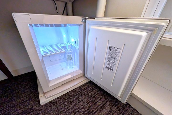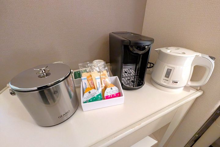 先述したデスク周りには、冷蔵庫をはじめ、湯沸かしポット、コーヒーマシンといったものも。