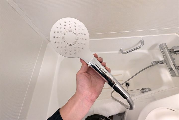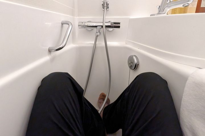 筆者(身長171cm)がバスタブに入ったときの目線はこんな感じ。足をグッと伸ばせないのはちょっと残念ではありますが、深めの造りになっているので、お湯をためれば全身を温められます。