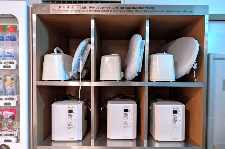 客室外の共有スペースには、アイロンや加湿器といった貸出備品もあります。クリーニングサービスもありますが、出し忘れや時間がないときなど、自身でアイロンがけできるのがいいポイントですね。