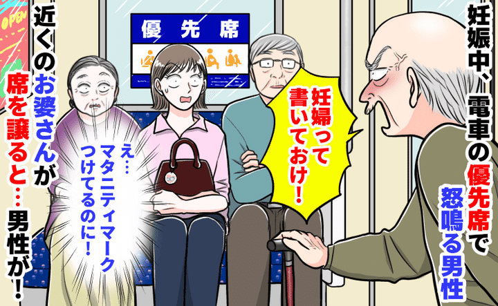 「妊婦って書いておけ!」妊娠中、電車の優先席で怒鳴る男性。近くのお婆さんが席を譲ると…男性が!