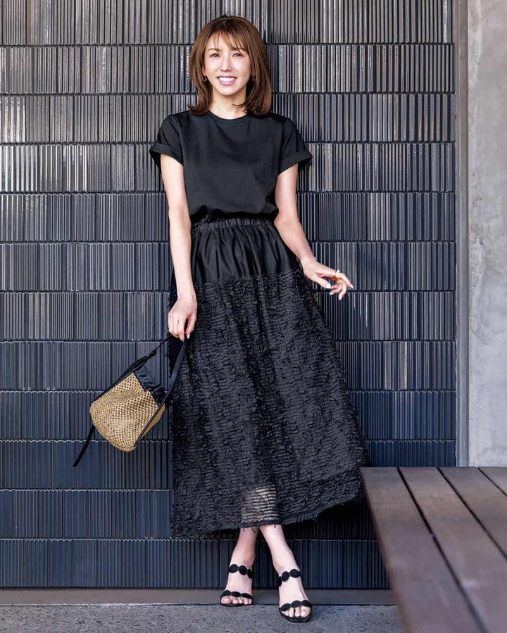 ヨーク部分に入ったピンタック、贅沢なギャザー使いが印象的なワンピース。暑い日でもさらりと着られるハリのある素材でストレスフリー。ブラックなら甘すぎない。