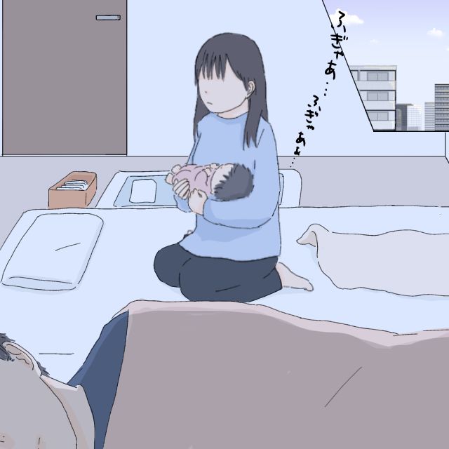 沙苗は抱っこしていないとなかなか寝付けません。寝たかな、と思ってそっと布団に寝かせようとするとまた泣き出して。そのうちミルクの時間、オムツ交換・・・そうしているうちに朝を迎える、の繰り返しです。そんな私と沙苗のすぐ隣では夫がぐっすり眠っています。