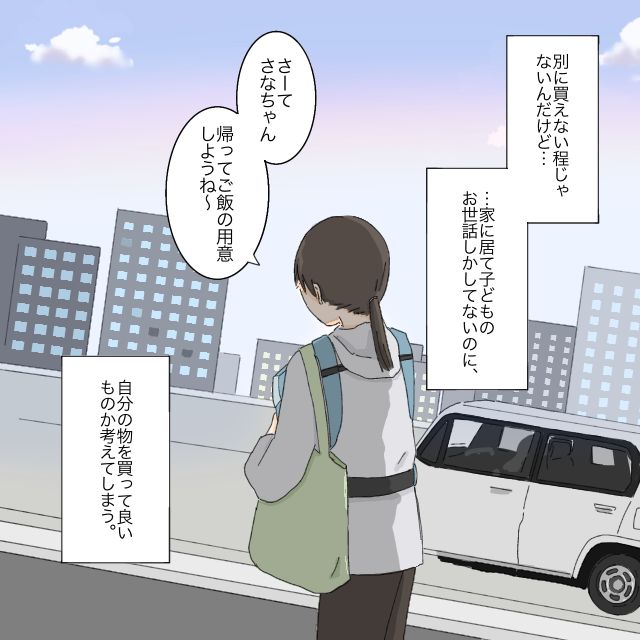 欲しい野菜だって、お菓子とコーヒーだって、別に買えないほどではありません。でも、今は働いて稼ぐことなく1日中家に居て、子どものお世話しかしていないのに、自分のものを買ってよいものかという考えがどうしても頭をよぎってしまうのです。