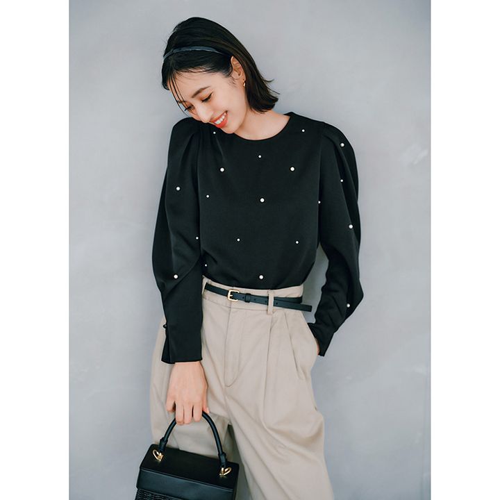 大小のパール付きブラウスで ワンツーコーデが華やぐ。 とろみ素材でキレイ見え