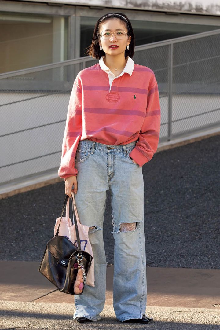 「オーバーサイズのラガーシャツをワイドなデニムとズルッとスタイリング。レースのタイツやポインテッドトウのヒール、赤リップやヘアスタイルで女性らしさも意識しました」