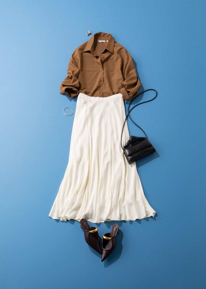 シャツは着回し。スカート¥25,300(カデュネ)バッグ¥14,300(アドカラム/アンソロジー)シューズ¥20,900(ジェイダブリューペイ/ビューティ&ユース ユナイテッドアローズ)ピアス¥74,800(ミチ ウィルウェイ/フォーティーン ショールーム)バングル¥121,000(ウノアエレ/ウノアエレ ジャパン)