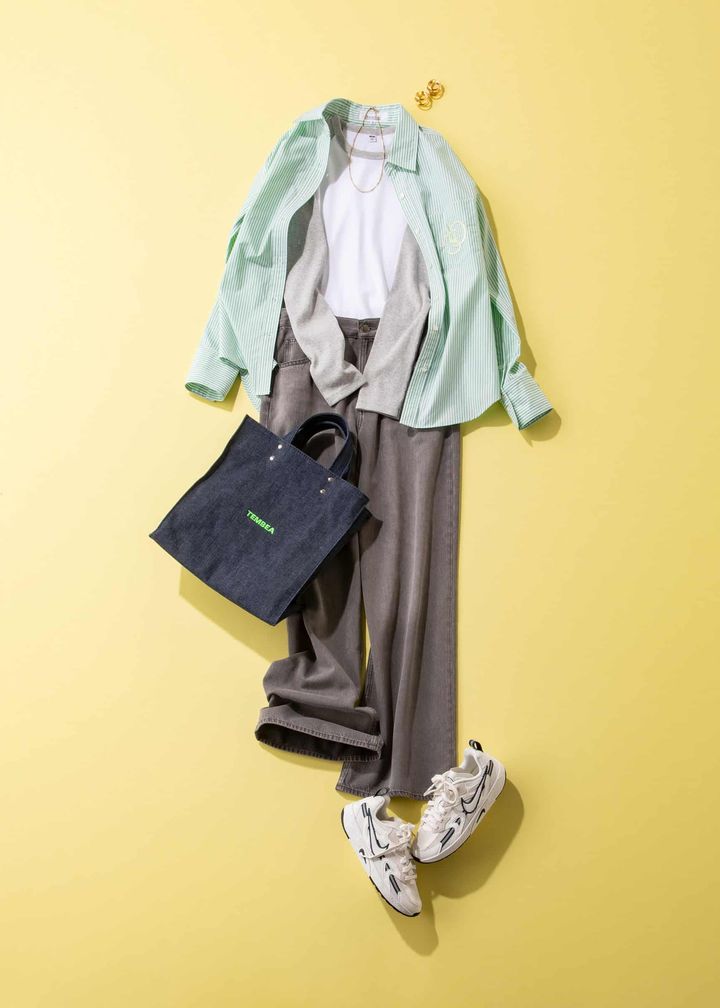 デニム×トートのカジュアルスタイルも、ストライプシャツなら爽やかにまとまる