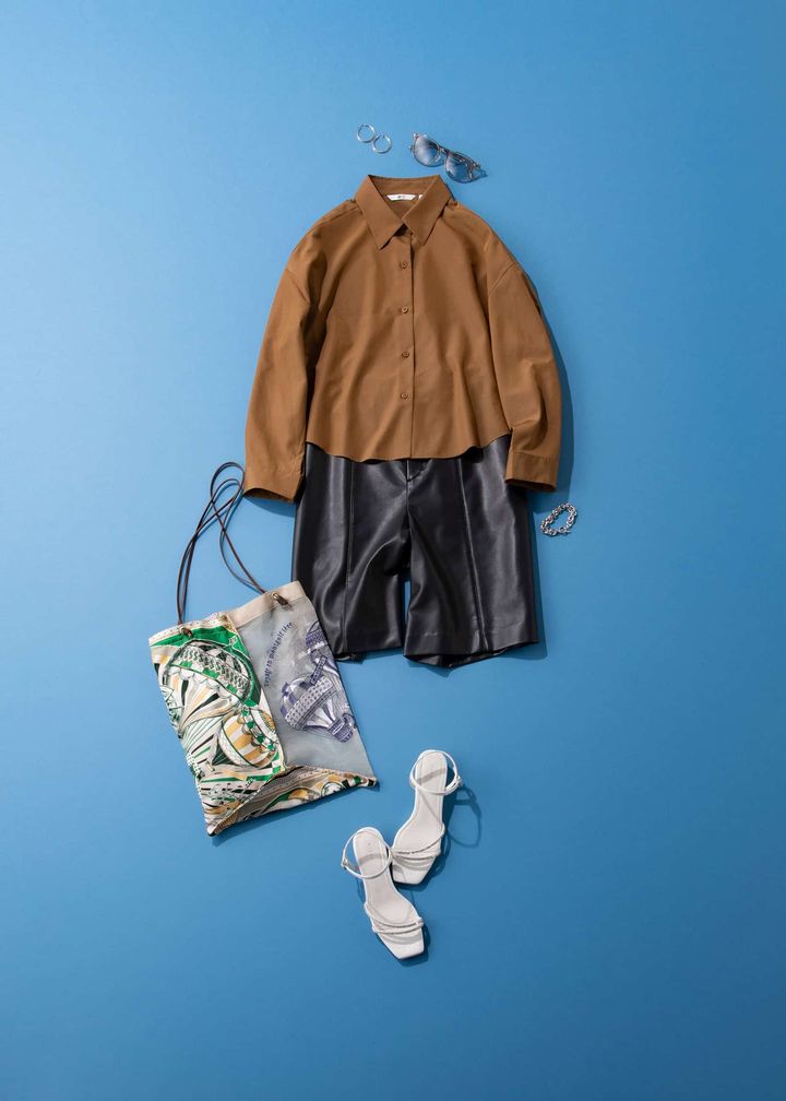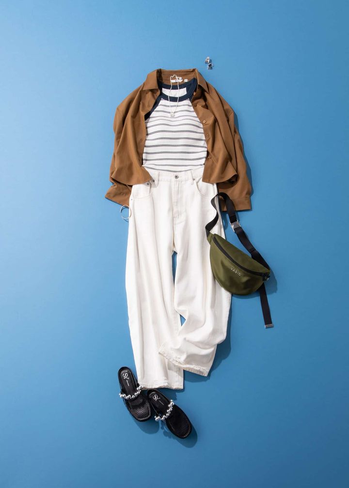 シャツは着回し。パンツ¥16,500(アルページュストーリー)バッグ¥25,300(マニプリ)シューズ¥8,910(ランダ)サングラス¥1,990(ユニクロ)ピアス¥107,800(ウノアエレ/ウノアエレ ジャパン)ブレスレット¥6,600(エイチアッシュ/フォーティーン ショールーム)