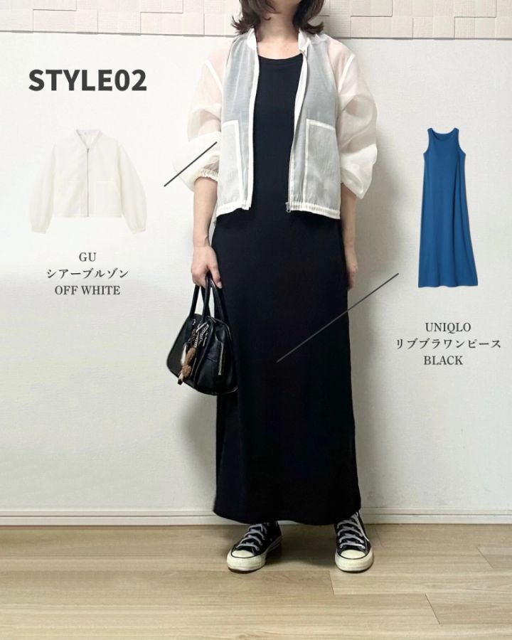 1枚でさらっと着てもおしゃれに決まる、タイトめなノースリーブワンピースがメインのこちらのコーデ。透け感のあるシアーブルゾンを羽織れば、さわやかな印象はそのままに気になる二の腕をカバーできます。ブルゾンがショート丈なので、スタイルアップが目指せるのもポイント!