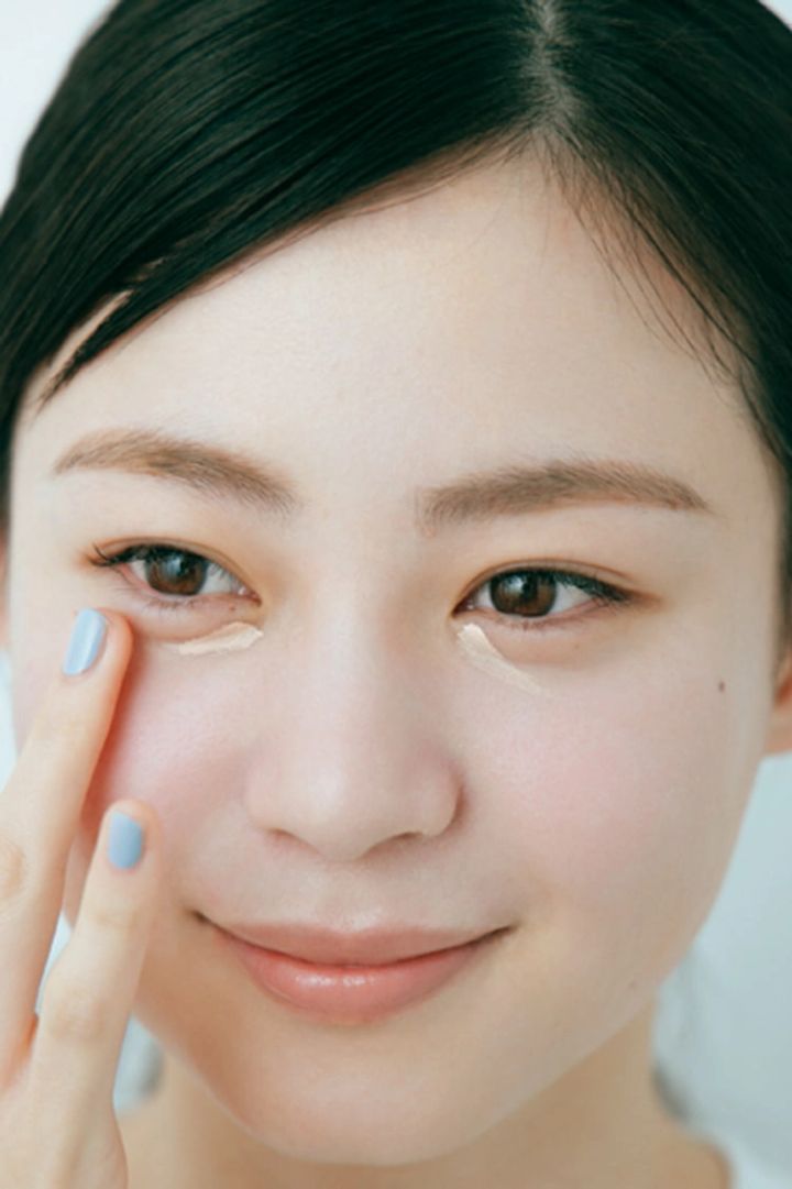 目の下のクマや口角にコンシーラーを塗布。ファンデなしなので、少し広めにのばし、肌の均整を取りながらなじませる。