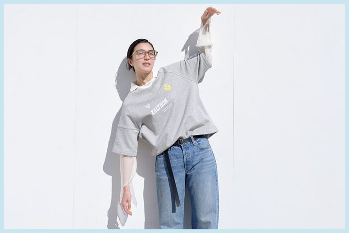 ユニフォームをイメージしたキャッチーなスウェット×デニムパンツのラフな着こなしは、シアートップスをインに合わせることで、ボーイッシュになりすぎず、やわらかな印象に。透け感が定番カジュアルのマンネリ化も払拭。
