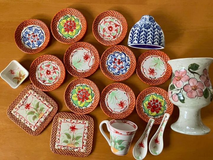 ートンボや蓮など伝統的な絵柄の物をお土産に。ベトナムを思い出しながらの家でのお茶時間が嬉しい。