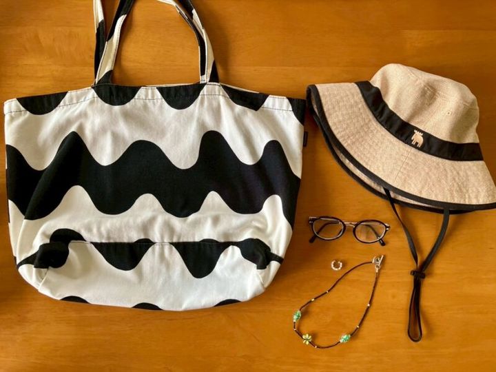 マリメッコのトートバッグ、帽子、だてメガネ、ビーズネックレスは黒色で統一したらそれだけでまとまり感がでたので、旅先でもそのままコーディネートすればOKそう!旅先でメイクばっちりという感じではないときには、すっぴんをごまかしてくれたり紫外線をカットしてくれるだてめがねや華やかさをプラスしてくれるアクセサリーが心強い味方になりますよね。だてめがねはGU、イヤーカフは3COINSと旅のアクセサリーは万が一なくしたり破損してもダメージ少なく、思いっきり旅を満喫できるようにプチプラで揃えました。