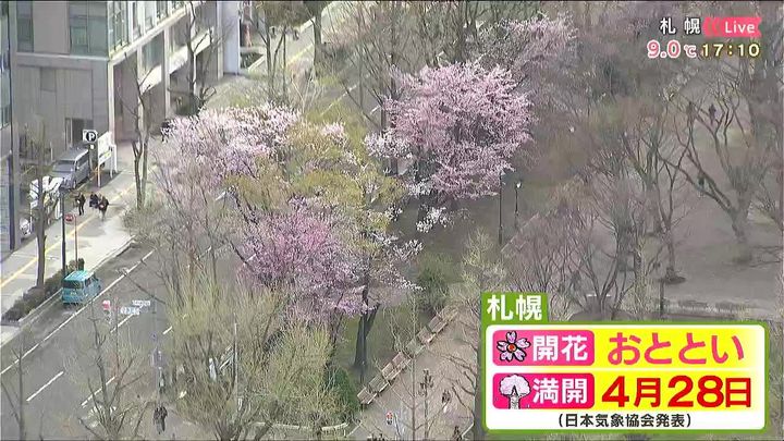 札幌の大通公園のサクラはきれいですね。満開は28日(月)の予想です。この先空気もヒンヤリしますが、その分、サクラの花は長持ちして、5月に入ってからも楽しめるかもしれません。