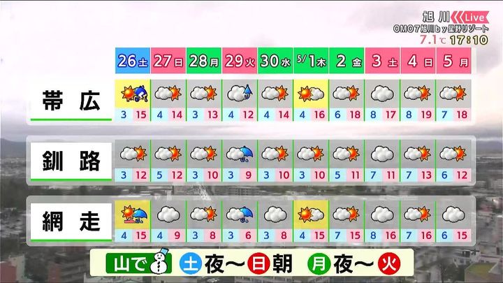 5月5日(月)までの10日間予報、まずは札幌・旭川・稚内です。