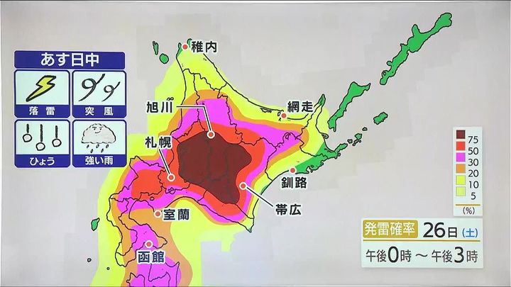 こちらは、あす26日(土)昼過ぎの雷が発生する確率です。大気の状態が非常に不安定になります。札幌や帯広周辺は赤色50%以上、旭川では茶色の75%以上と高くなります。落雷や竜巻などの激しい突風、ひょうや強い雨、天気の急変に注意して下さい。