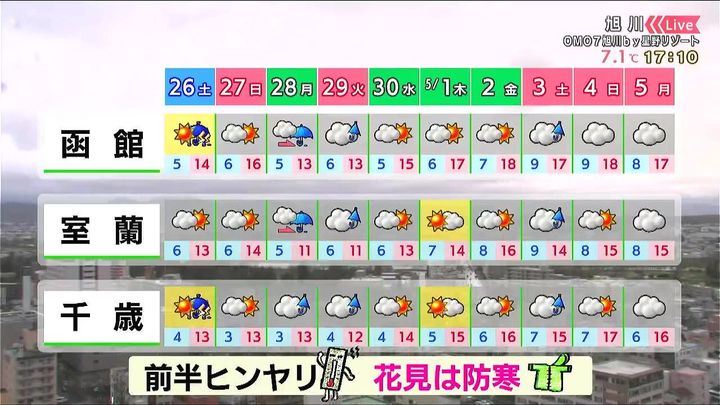 日曜は日差しが出て、大きな崩れはありません。月曜と火曜は雨が降るでしょう。連休前半は極端に暖かくなることはないので、お花見は防寒対策が必要です。