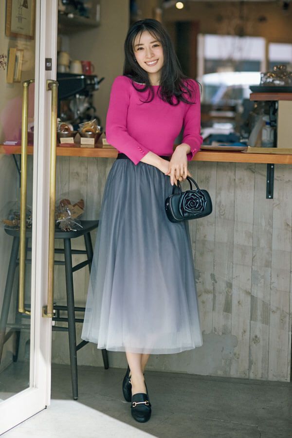 温もりカラーよりもブルべ向きピンクとの相性がいいのは、温度感低めのキリッとしたグレー。ブルべ肌の透明感が増すような深みピンクを選ぶと、×グレーの都会的な配色がより洗練度アップ。ピンクの濃度が高いぶん、グレースカートは裾に向かって色みを薄めたグラデ染めで軽やかに。黒小物で甘甘見えもセーブ。