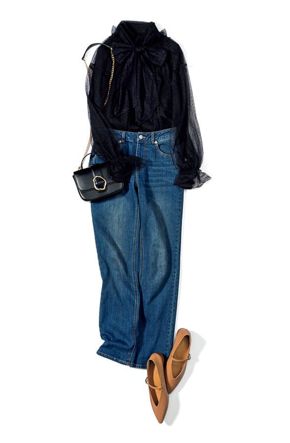 ボウタイブラウス¥20,900/ストラ デニムパンツ¥3,990/神戸レタス バッグ¥7,700/オリエンタルトラフィック(ダブルエー) パンプス¥24,200/HIMIKO(卑弥呼)
