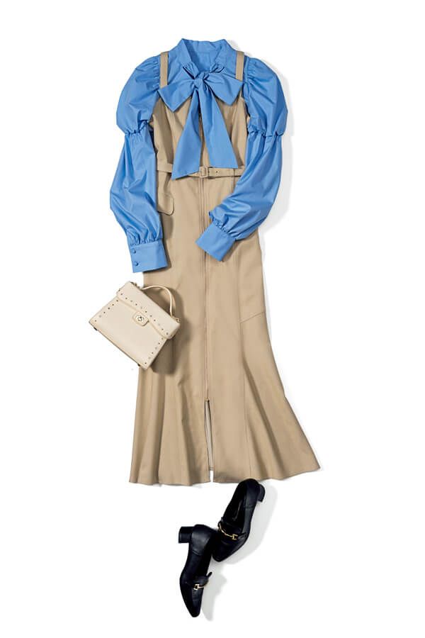 トレンチ素材のジャンスカによく映える、ブルーブラウスを当てておしゃれ配色を味方につけて。