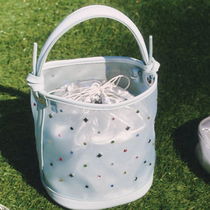 きれいめにもカジュアルにもあわせやすいバケツバッグ。カラフルなビジュー使いにキュン♡