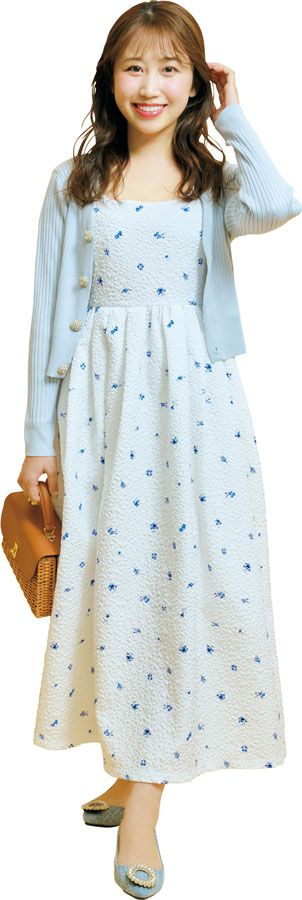 淡いブルーの小花柄ワンピはジャカード素材で旬な雰囲気に。清潔感あるブルーワンピで大人っぽくまとめつつ、小花柄やカゴバッグでキュートらしい可愛いさをプラス。フラットシューズについたビジューも丸みのあるデザインなので、足先が直線的でも上品にまとまります。