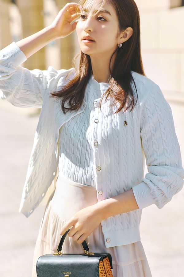 お育ちよさげなケーブル編みニットの、どこかクラシカルな上品さが今とっても新鮮! 編み目の立体感で、無地の白ニット地がぐんと華やかに。胸元のイニシャルメタルとゴールドで縁取ったボタンも、華やかさを添える好アクセントです。セットで着ると、グッドガール感が増してさらに今年っぽく。