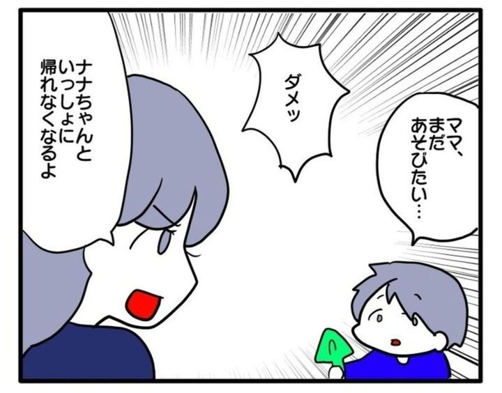 主人公・ナナちゃんママはジロウくんママに執拗に付きまとわれ、うんざりしていました。公園やスーパーを探し回って待ち伏せされることが続き、心身ともにストレスの限界に。そしてついに、はっきりと「幼稚園以外での付き合いはやめたい」と告げることができました。
